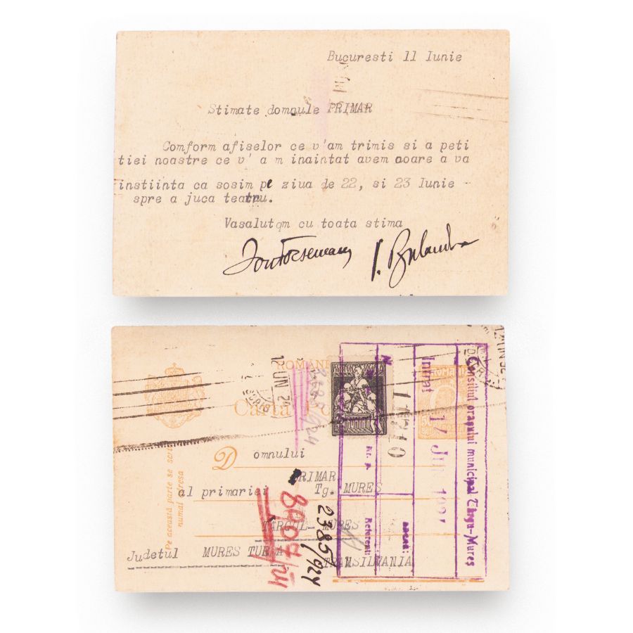 Carte poștală expediată de Ioan Focșăneanu și Ion Bulandra primarului orașului Târgu Mureș, prin care îl anunță că vor sosi în zilele de 22 și 23 iunie pentru a juca teatru. Aceasta este datată 11 iunie 1924.