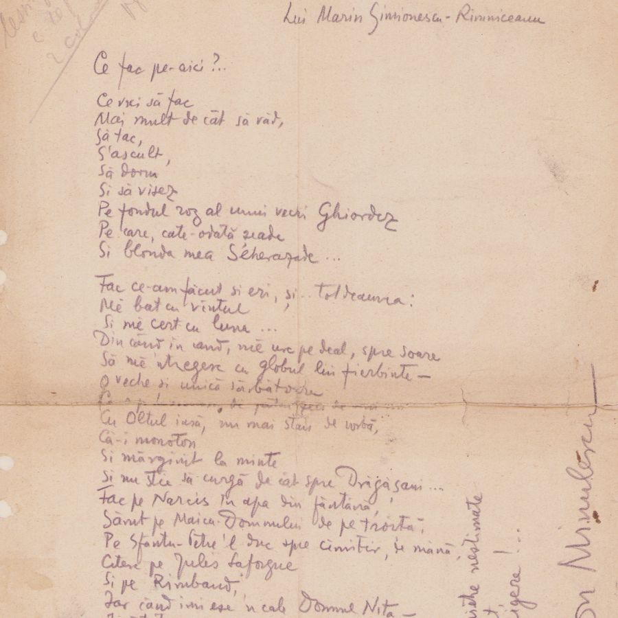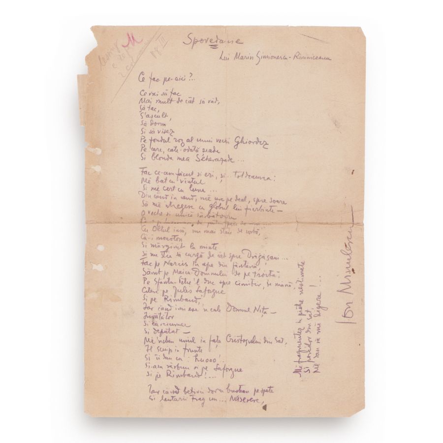 Poezie-manuscris intitulată Spovedanie lui Marin Simionescu-Rîmniceanu și redactată de Ion Minulescu. Aceasta este redactată olograf, cu creionul, pe o coală velină și este semnată la final.