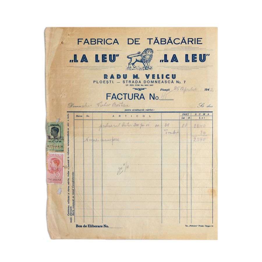 - Factură emisă de Fabrica de tăbăcărie „La Leu” Radu M. Velicu, pe numele lui Victor Boitan, datată 25 aprilie 1942.