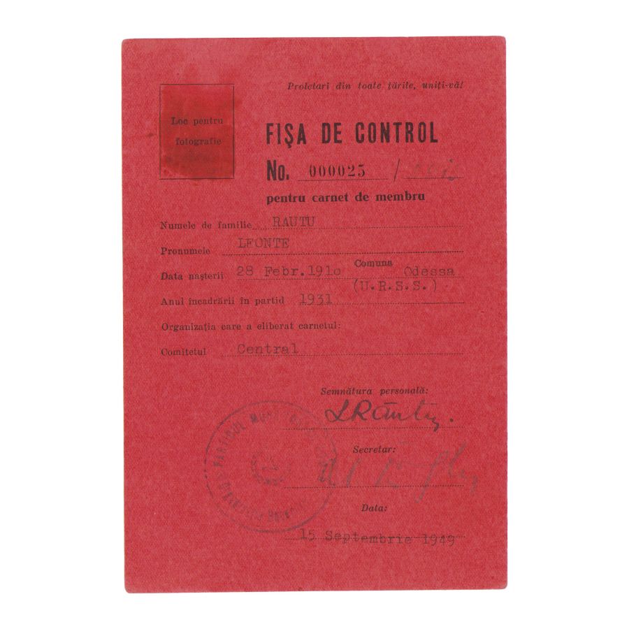 Fișă de control pentru carnet de membru pe numele lui Leonte Răutu, de origine evreiască, născut la data de 28 februarie 1910 în comuna Odessa, ce a fost încadrat în Partidul Muncitoresc Român în anul 1931. Fișa a fost eliberată la data de 15 septembrie 1949. Leonte Răutu a fost un om politic comunist, ce a deținut funcția de vicepreședinte al consiliului de miniștri în perioada 1969-1972.