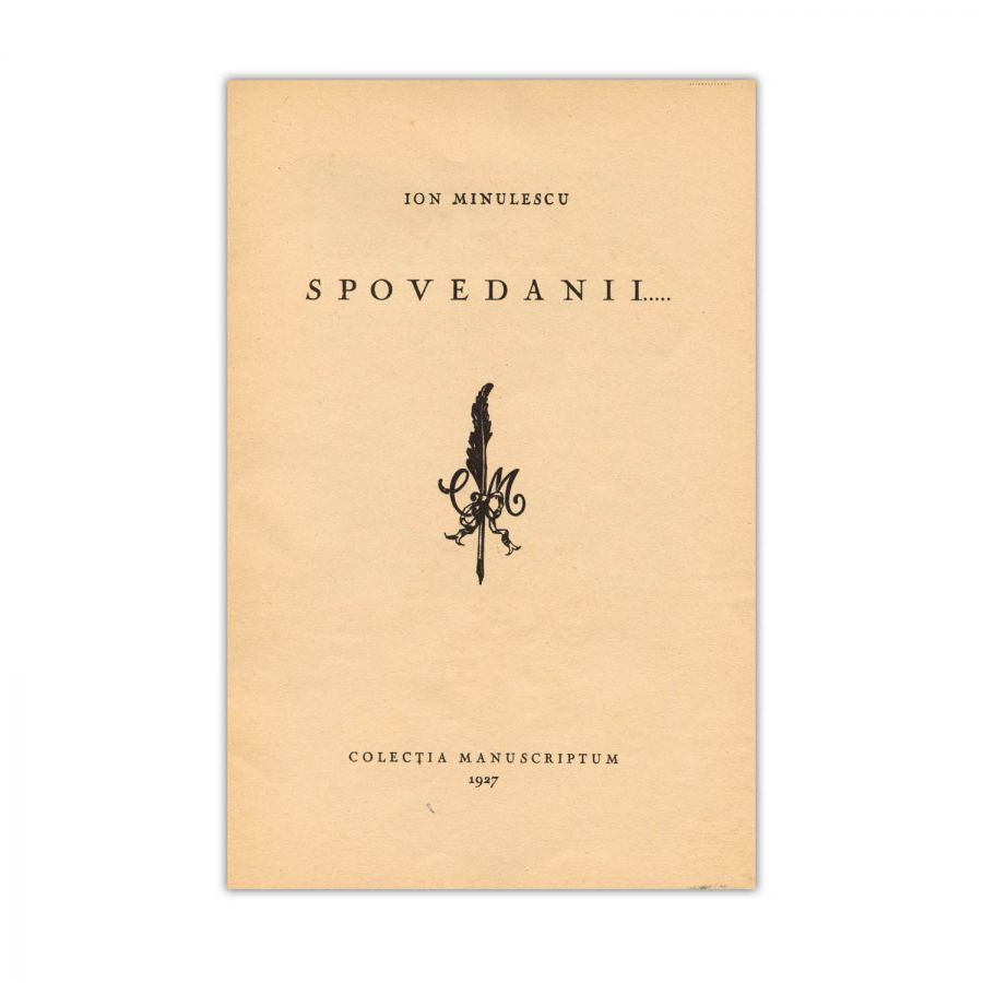 I. Minulescu, Spovedanii, 24 p. Exemplar numerotat cu numărul 353. Cu o litografie la începutul volumului a lui Ion Minulescu după un desen de Corneliu Mihăilescu.