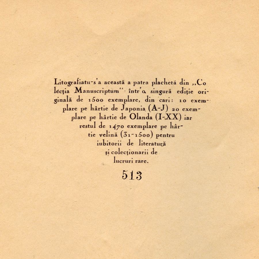 L. Rebreanu, Cântecul Lebedei, 25 p. Exemplar numerotat cu numărul 513. Cu o litografie la începutul textului a lui Liviu Rebreanu după un desen de I. A. Steriade.