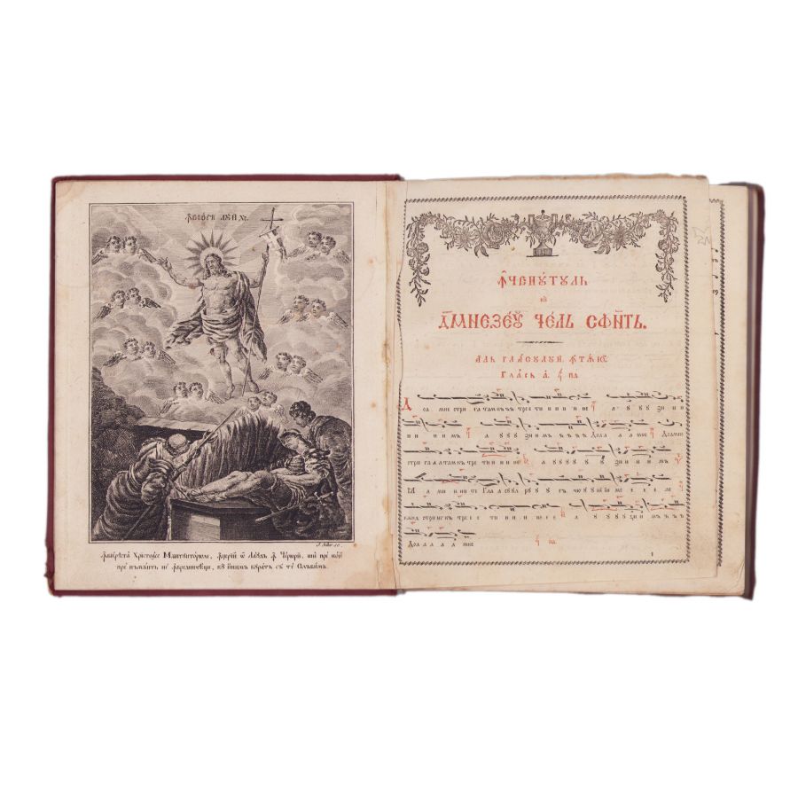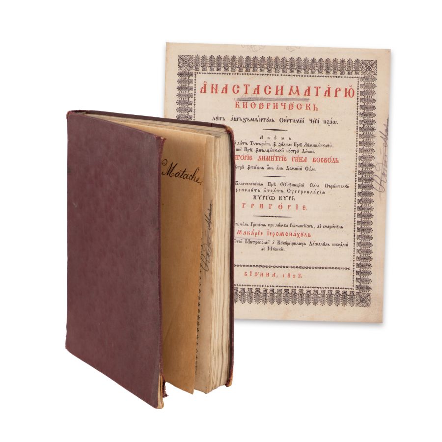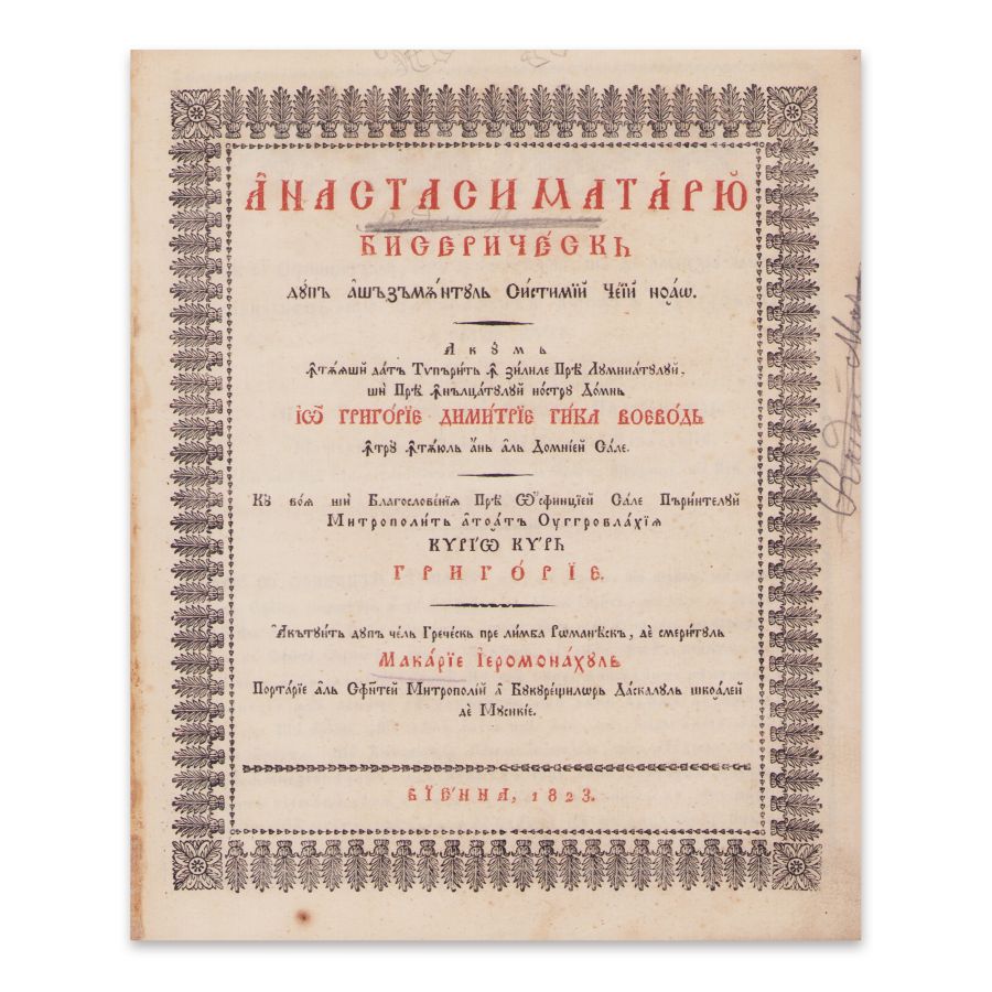 Anastasimatariu bisericesc după aşăzământul Sistimii ceii noao. Acum întâiași dată tipărit în zilele Prea înălţatului nostru Domn Io Grigorie Dimitrie Ghica Voevod, întru întâiul an al domniei Sale; cu voia şi blagosloveniia Prea Osfinţiei sale părintelui Mitropolit a toată Ungrovlahiia Kyrio Kyr Grigorie. Alcătuit după cel grecesc pre limba Romanească de smeritul Macarie ieromonahul, Portarie al Sfintei Mitropolii a Bucureştilor, Dascalul Şcoalei de Musichie. Vienna, [Mechitaristen-Congregations-Buchdruckerei, i.e. tipografia călugărilor armeni din diaspora], 1823. [4] f., 300 p., [1] f. : il ; 4° (23 cm), 13 R (19 x 15 cm)