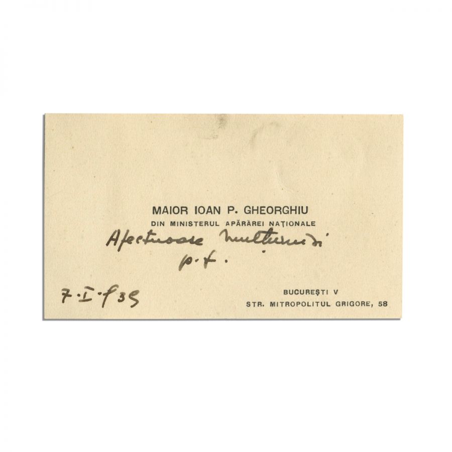 Carte de vizită ce a aparținut Maiorului Ioan P. Gheorghiu, membru al Ministerului Apărării Naționale. Cartea de vizită păstrează o însemnare olografă datată 7 ianuarie 1939, prin care transmite afectuoase mulțumiri.