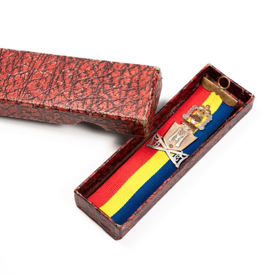 Breloc de ceas realizat cu ocazia Marii Uniri din 1918. Brelocul a fost realizat dintr-o bandană tricoloră pe care a fost aplicată un blazon.