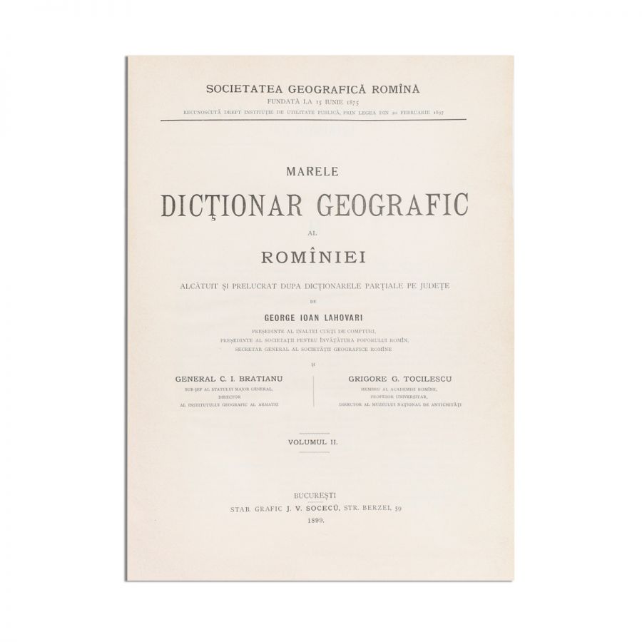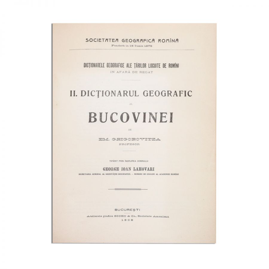 Volumul II, 1899, 800 p. colligat cu Em. Grigorovitza, Dicționarele Geografice ale țărilor locuite de români în afară de regat. II. Dicționarul Geografic al Bucovinei, București. Atelierele grafice Socec & Co., 1908, 248 p.