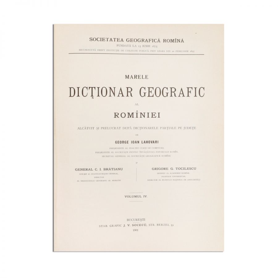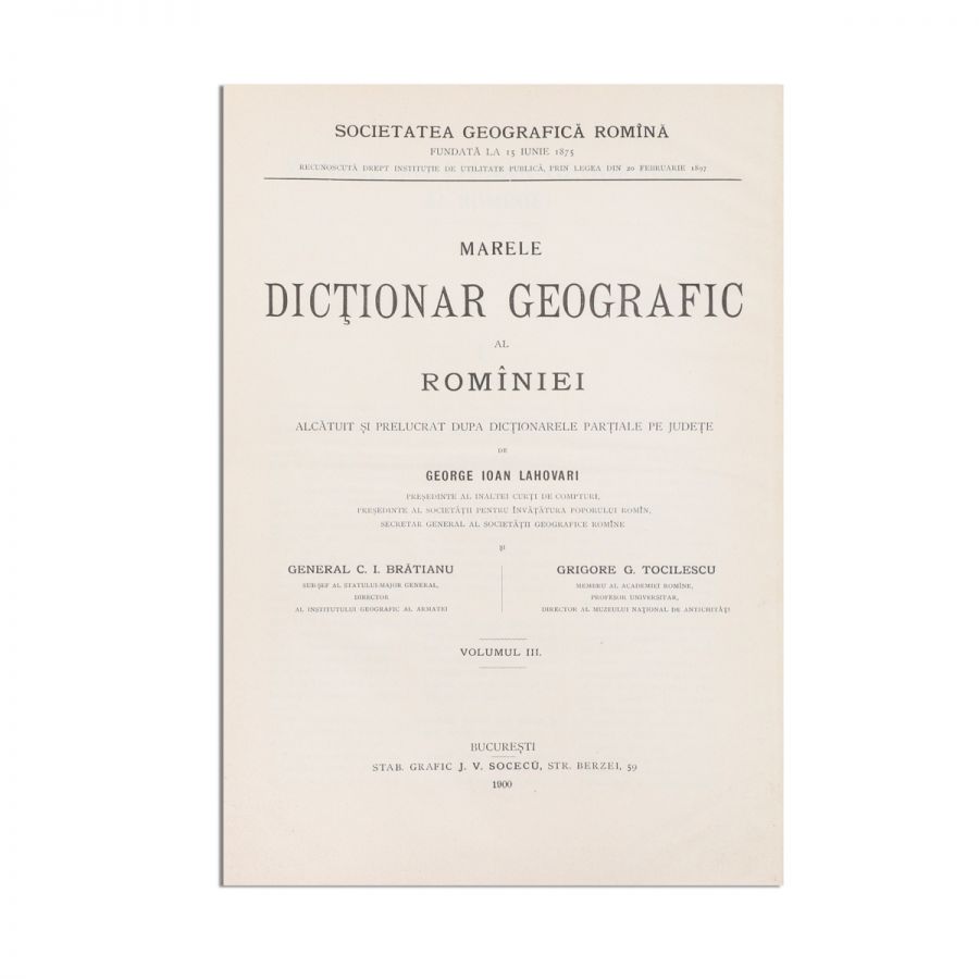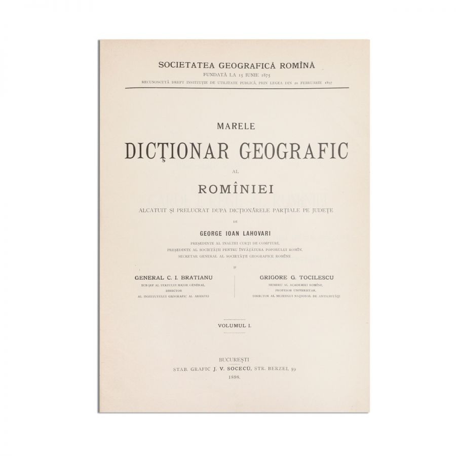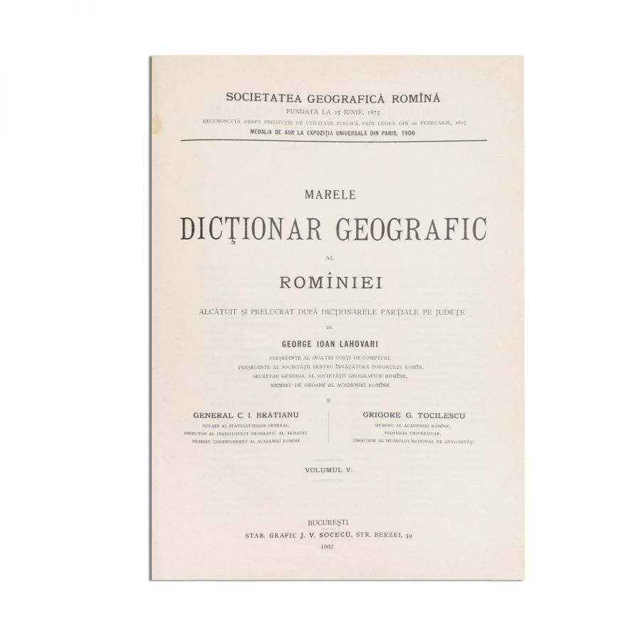 George Ioan Lahovari, C. I. Brătianu și Grigore G. Tocilescu, Marele dicționar geografic al României, alcătuit și prelucrat după dicționarele parțiale pe județe, București, Stabilimentul Grafic Socec, 5 volume: