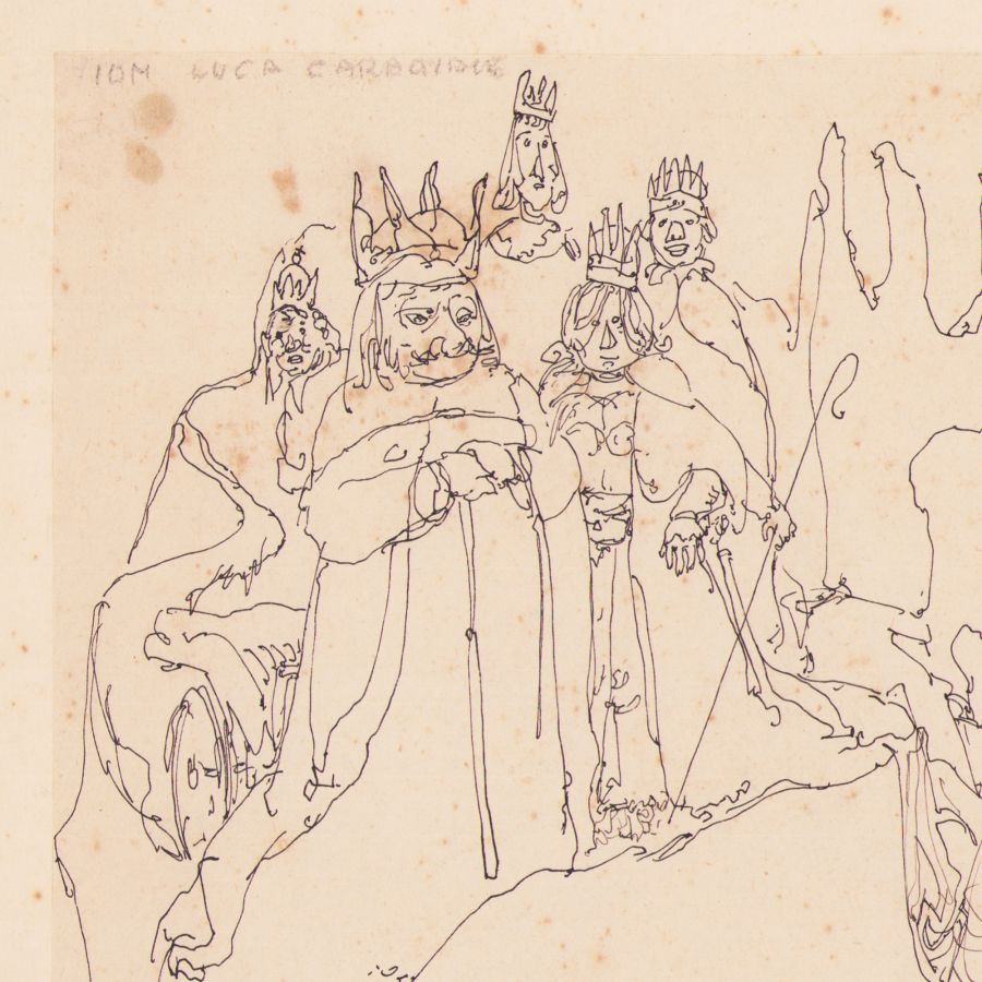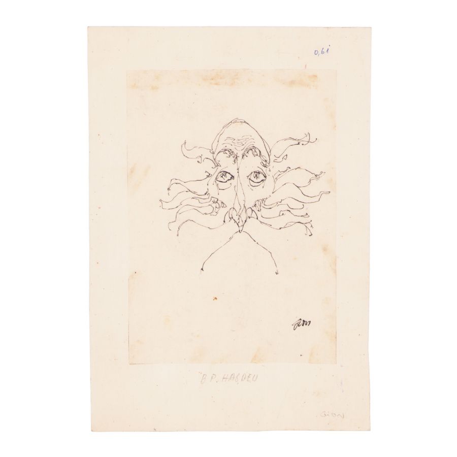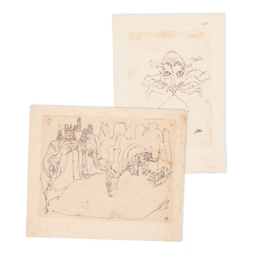 Două lucrări de grafică realizate în peniță de ilustratorul Mihail D. Gion. Una dintre ele reprezintă o caricatură a lui B. P. Hasdeu, iar cea de-a doua înfățișează o scenă din povestirea Imitație de I. L. Caragiale, conform însemnărilor în creion. Una dintre lucrări este semnată olograf, în peniță în colțul din dreapta jos.