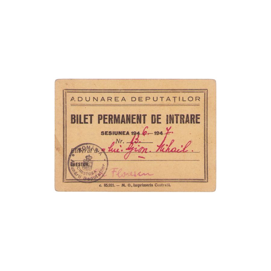 Bilet de permanent de intrare în Adunarea Deputaților, sesiunea 1946-1947, eliberat pe numele lui Gion Mihail.