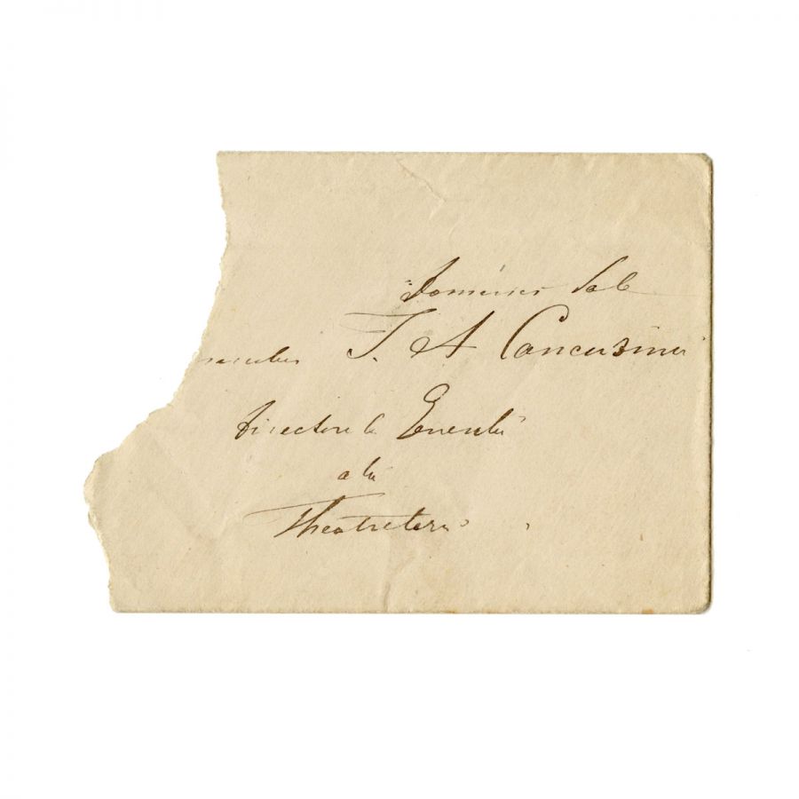 Carte de vizită ce a aparținut artistului și comediantului [Mihail] Pascaly. Aceasta păstrează o însemnare olografă adresată, conform plicului, domnului I. A. Cantacuzino. Se păstrează și plicul în care a fost expediată cartea de vizită.