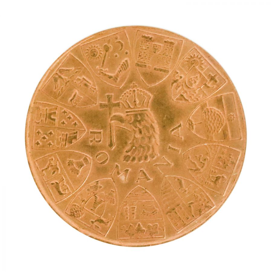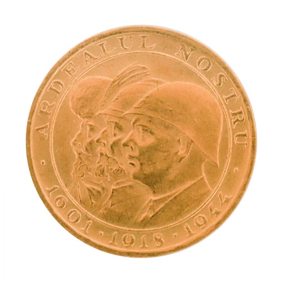 Monedă din aur (900‰) cunoscută generic după numele „Ardealul nostru” bătută în anul 1944. Pe avers au fost reprezentate busturile acolate ale domnitorului Mihai Viteazul, regele Ferdinand I și regele Mihai I. Pe revers în centrul monedei a fost reprezentat un cap de acvilă spre stânga cu crucea în cioc și coroana pe cap, înconjurat de blazoanele celor 11 județe transilvănene eliberate în 1944. Aversul monedei a fost realizat de gravorul H. Ionescu, iar reversul de gravorii Ioana Bassarab Starostescu și Ștefan Iordache.