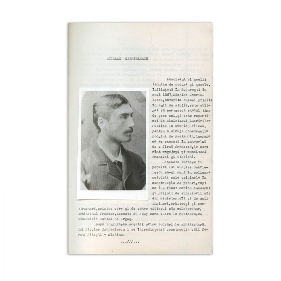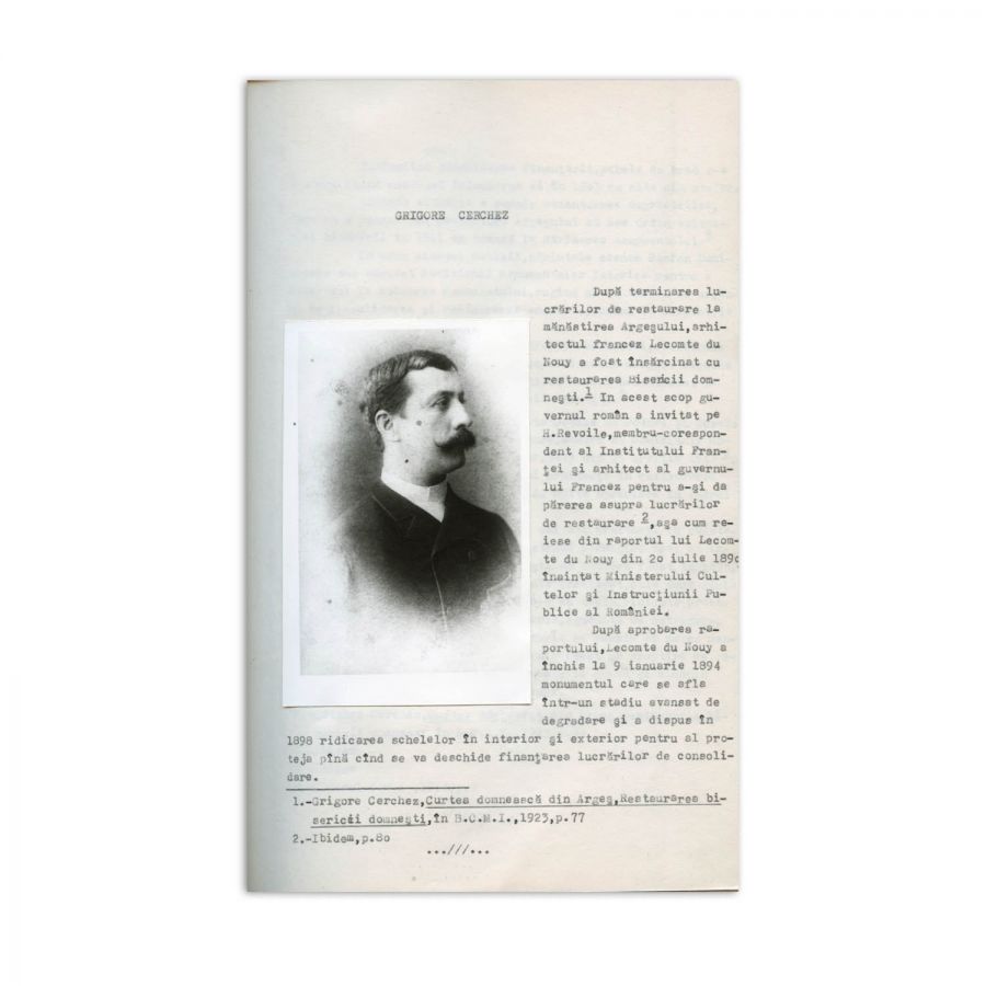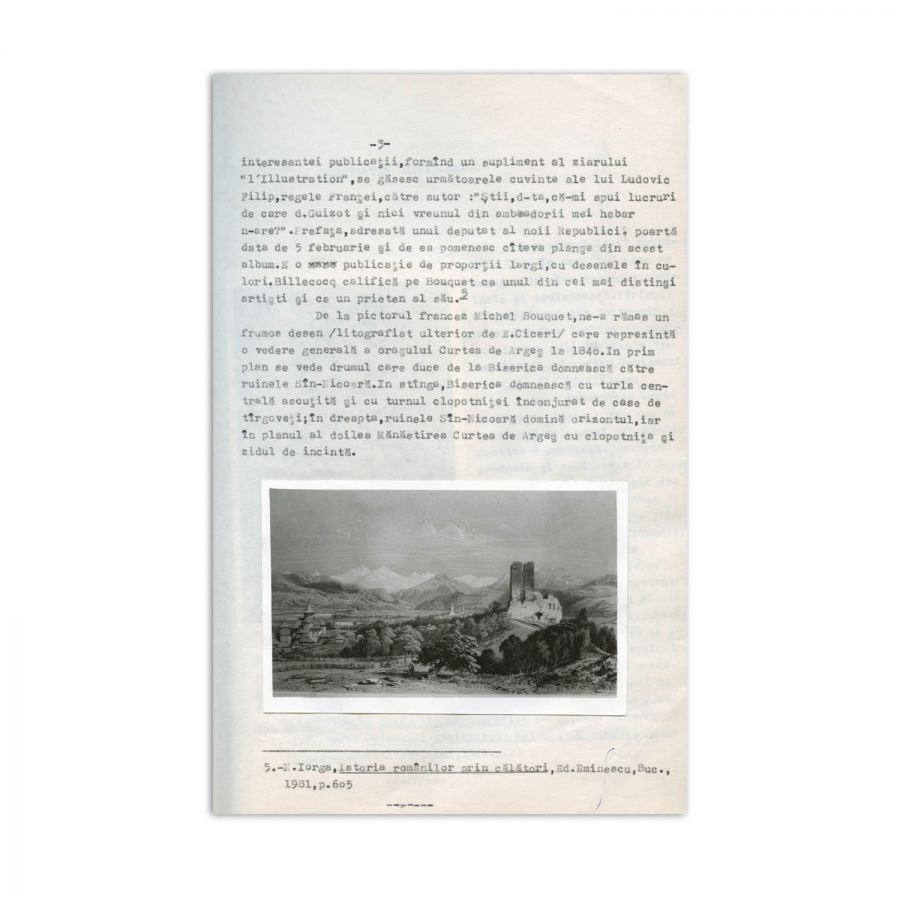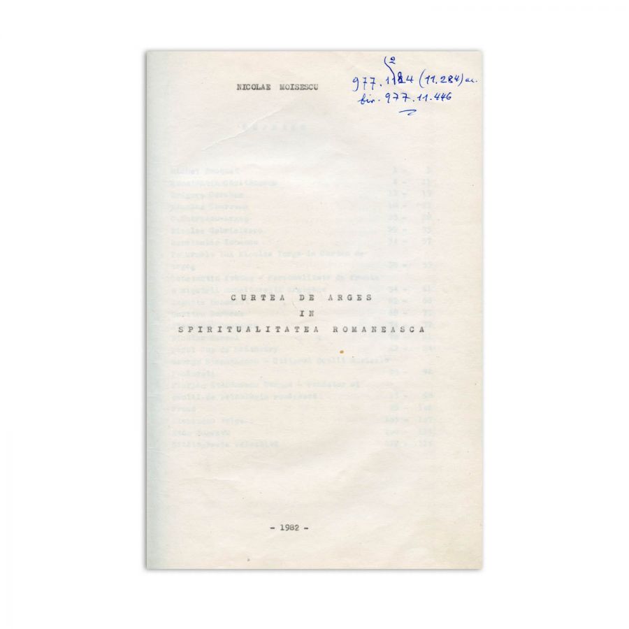 Dactilograma lucrării lui Nicolae Moisescu, Curtea de Argeș în spiritualitatea românească, ce urma să fie publicată în anul 1982. Lucrarea este structurată în 20 de capitole, fiecare dintre acestea fiind dedicate unei personalități marcante pentru istoria orașului Curtea de Argeș, respectiv: Michel Bouquet, Constantin Căpităneanu, Grigore Cerchez, Nicolae Codreanu, Const. Dobrescu - Argeș, Nicolae Gabrielescu, Haralamb Ionescu, Nicolae Iorga, Constantin Ivanus, August Lancelot, Dumitru Norocea, Alexandru Odobescu, Nicolae Russel, Carol Pop de Szathmary, George Stephanescu, Florian Stefanescu Goanga, Urmuz, Alexandru Valescu, Radu Zugravu. Prefața lucrării a fost scrisă de Șerban Cioculescu, care o și semnează olograf. Dactilograma însumează peste 110 pagini, nenumerotate, care pe alocuri cuprinde corecturi olografe.