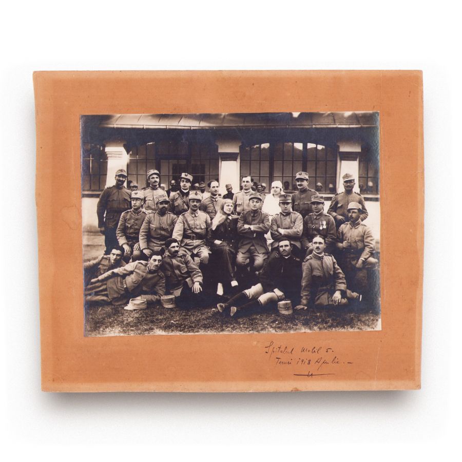 Fotografie de epocă ce înfățișează personalul medical militar al spitalului mobil nr. 5, pozând în fața clădiri spitalului de la Tecuci. Conform însemnării din partea inferioară aceasta a fost realizată în luna aprilie 1918.