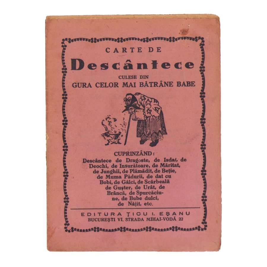 Carte de descântece culese din gura celor mai bătrâne babe, cuprinzând descântece de dragoste, de isdat, de deochi, de însurătoare, de măritat, de junghi, de plămădit, de beție, de muma pădurii, de dat cu bobi, de gâlci, de scârbeală, de gușter, de urât, de brâncă, de spurcăciune, de bube dulci, de năjit, București, Editura Țicu I. Eșanu, f.a., 16 p.