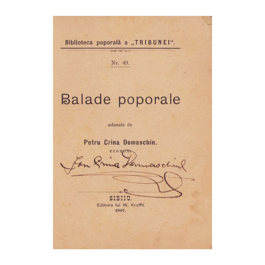 Biblioteca poporală a „Tribunei”, nr. 49, Balade poporale adunate de Petru Crina Domaschin, Sibiu, Editura lui W. Krafft, 1907, 125 p.