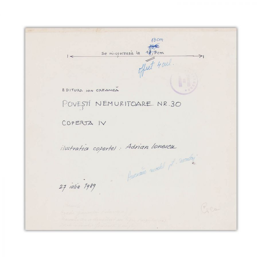 Două planșe realizate de Adrian Ionescu pentru coperțile I și IV ale volumului Povești nemuritoare nr. 30. Acestea sunt pictate în tempera și sunt datate 27 iulie 1989.