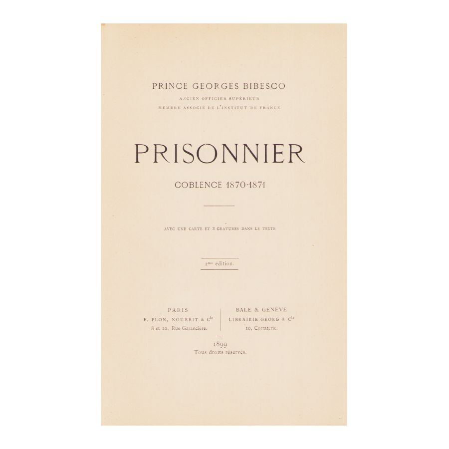 Prince George Bibesco, Prisonnier. Coblence 1870 - 1871, Paris, E. Plon, Nourrit & Cie, Bale & Geneve, Librairie Georg & Cie, 1899, 216 p. Cu o hartă și trei gravuri în text.