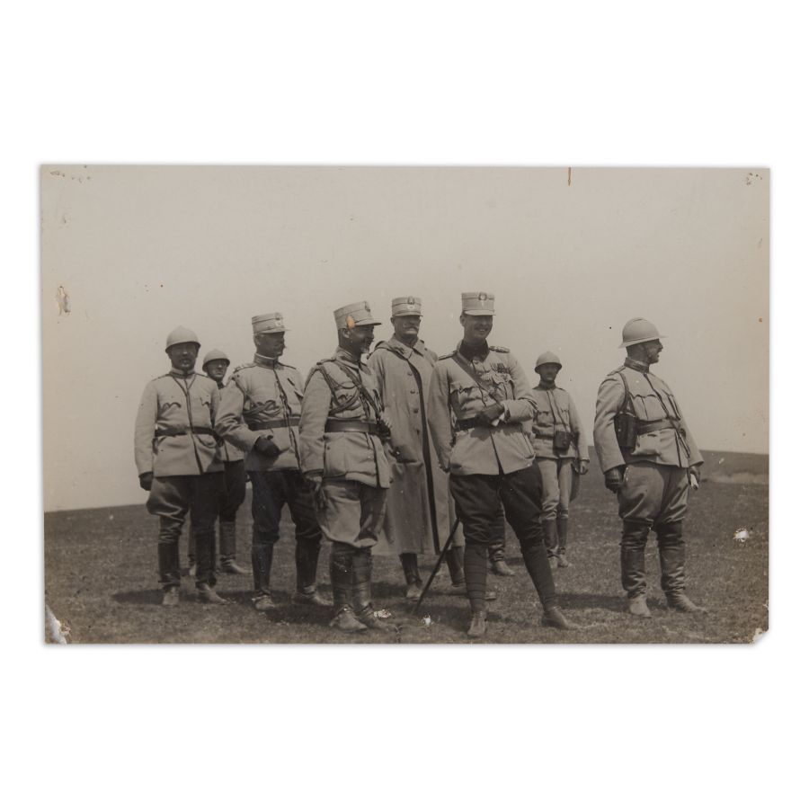 Fotografie de epocă ce îi înfățișează pe principele Carol al II-lea, mareșalul Ferdinand Foch și Traian Moșoiu pe front în timpul Primului Război Mondial.