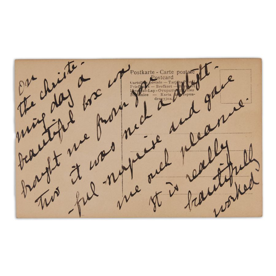 Fotografie tip carte poștală în care este înfățișată principesa Maria, viitoarea regină a României, alături de animalul său de companie și cele două dintre fiicele sale, principesa Elisabeta și principesa Mărioara, pozând într-un cadru de interior. Pe recto regăsim semnătura olografă a reginei, iar pe verso o amplă însemnare în limba engleză în care menționează că a primit o cutie frumos lucrată, fiind o surpriză încântătoare și plăcută.