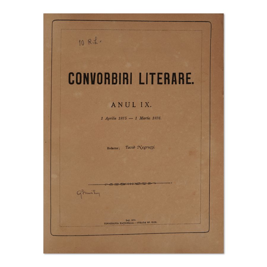 Publicația „Convorbiri Literare”, Anul IX, 12 numere colligate, 1 aprilie 1875 - 1 martie 1876, Iași, Tipografia Națională, 1876, 483 p.