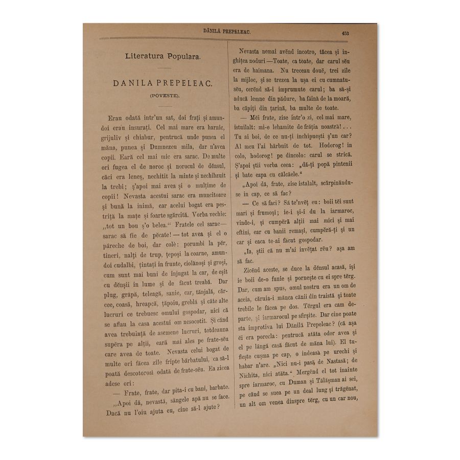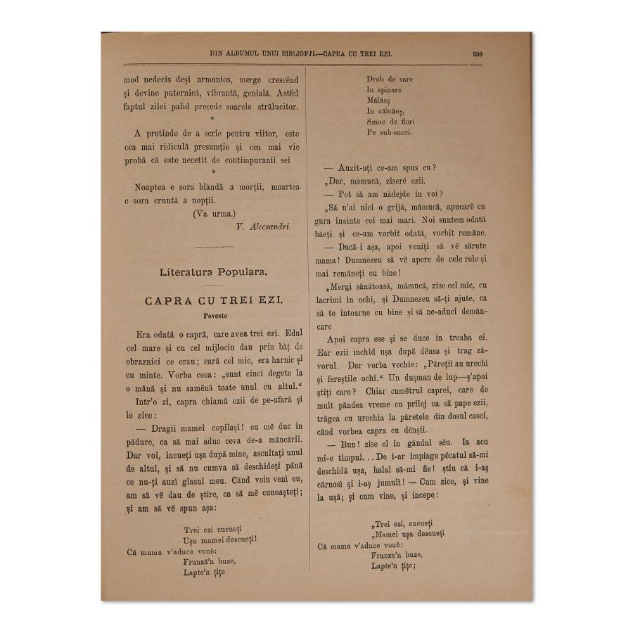 Publicația „Convorbiri Literare”, Anul IX, 1875-1876, cu „Punguța cu doi bani”, „Capra cu trei iezi” de I. Creangă, „Popa Tanda” de I. Slavici, cu ex-librisul lui Geo Dumitrescu