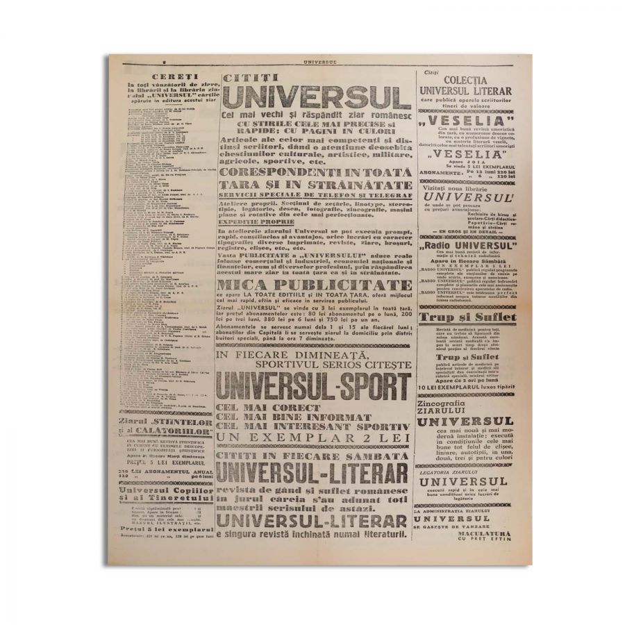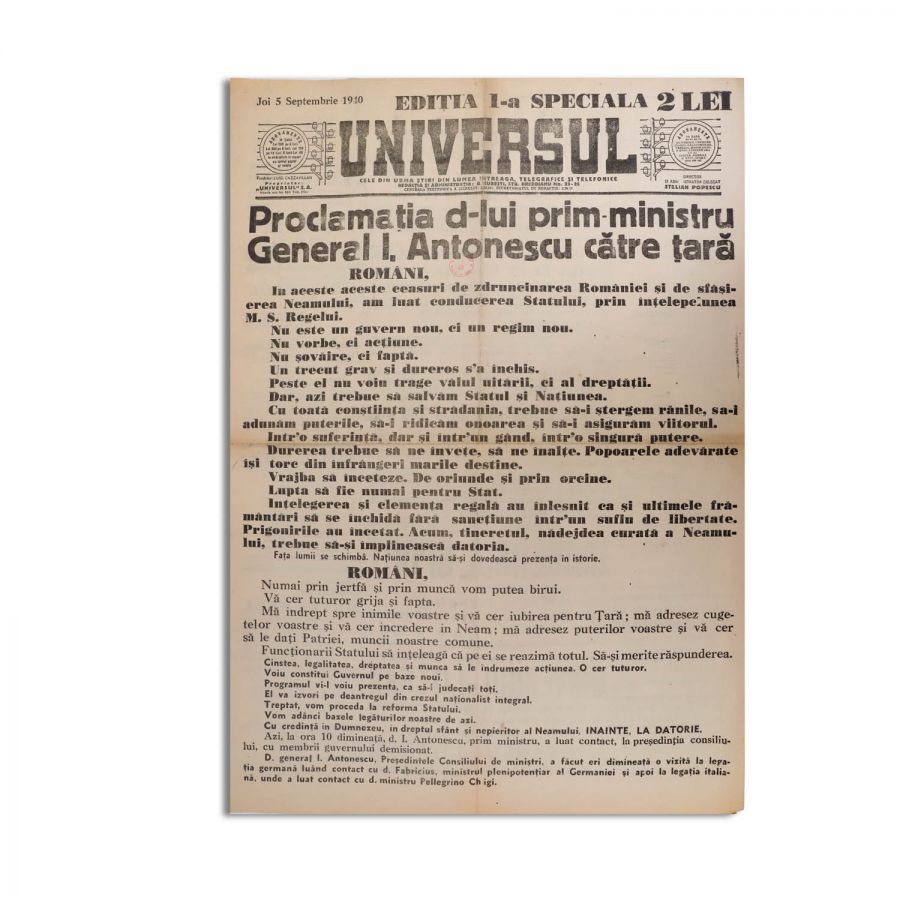 Publicația „Universul” din 5 septembrie 1940, 2 p. Ediția I specială în care este prezentată proclamația d-lui prim-ministru general I. Antonescu către țară.