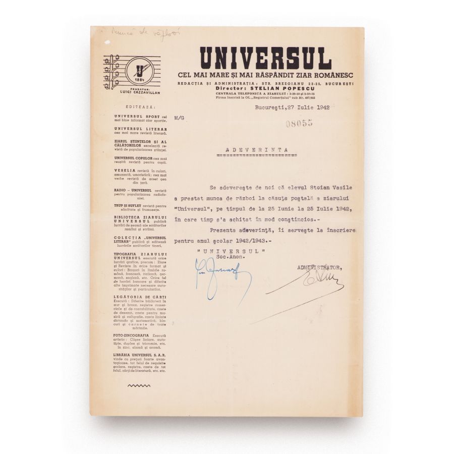 Adeverință emisă de publicația „Universul”, prin care afirmă că elevul Stoian Vasile a prestat muncă de război la căsuța poștală a ziarului în perioada 25 iunie-25 iulie 1942. Prezenta adeverință este necesară pentru înscrierea în anul școlar 1942-1943. Aceasta este dactilografiată pe o filă cu antetul publicației „Universul”.