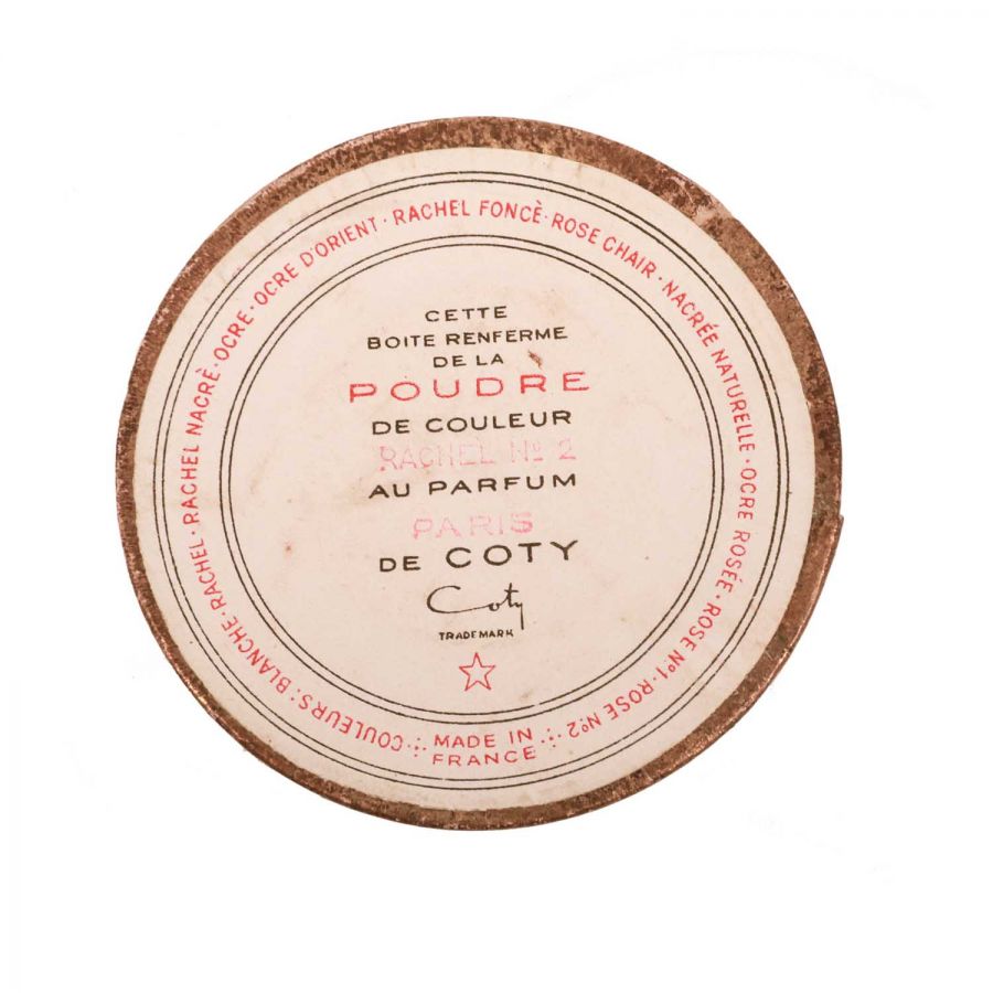 Pudră de față în culoarea Rachel no. 2 realizată de compania franțuzească Coty. Aceasta vine în cutia originală de epocă de carton decorată cu o dungă aurie.