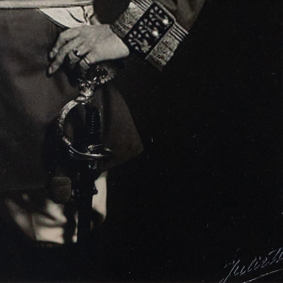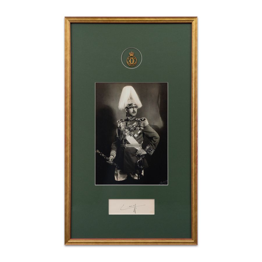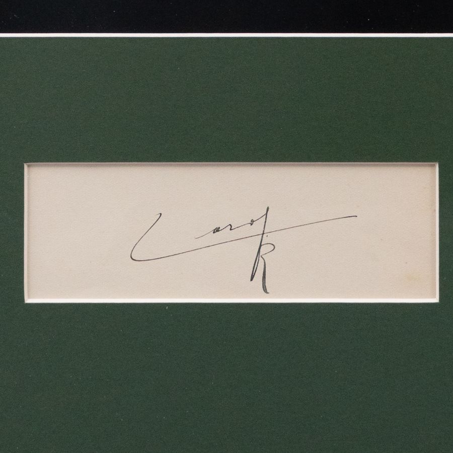 Lot format dintr-o reproducere fotografică a regelui Carol al II-lea, bilet cu semnătura olografă a acestuia și cifrul său încoronat. Acestea vin înrămate într-o ramă contemporană.