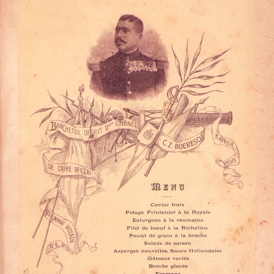 Meniul banchetului oferit domnului Colonel C. Z. Boerescu de către ofițerii Regimentului Mihai Viteazu no. 6 la data de 11 aprilie 1898. Acesta este ilustrat cu portretul colonelului.