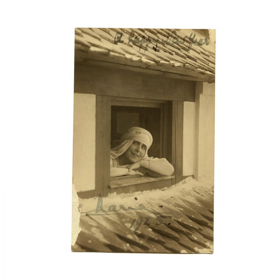 Regina Maria la castelul Bran, carte poștală fotografică, 1925, cu semnătura olografă a Reginei.