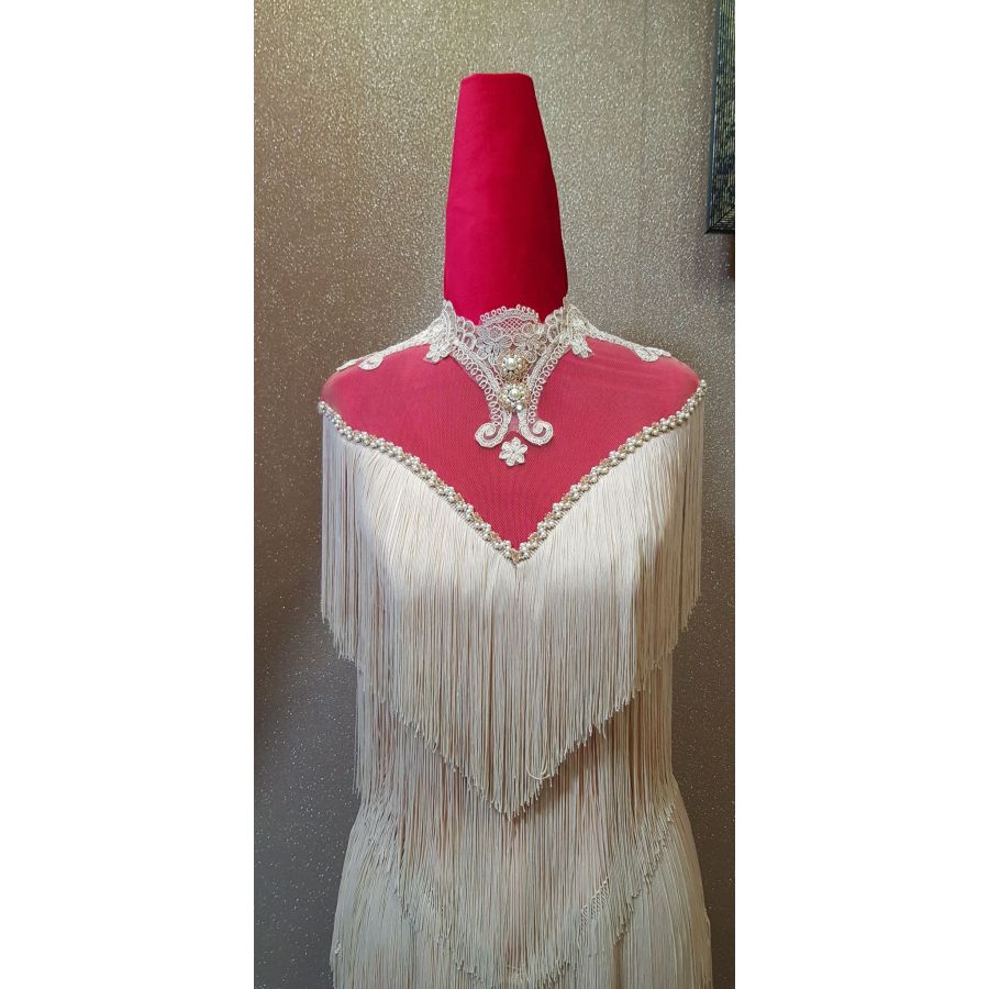Rochie pentru ceremonie realizată din franjuri, lucrată manual și accesorizată cu un șirag din cristale Swarovski.
