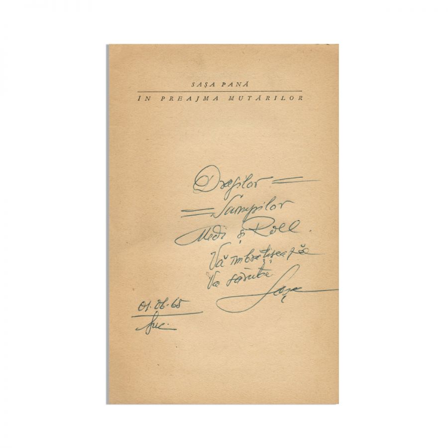 Volumul poartă pe pagina de gardă dedicația olografă a autorului către cuplul Medi și Gheorghe Dinu (Stephan Roll), datată 1965.