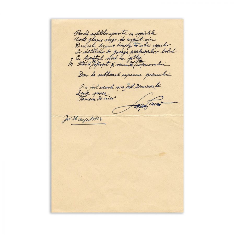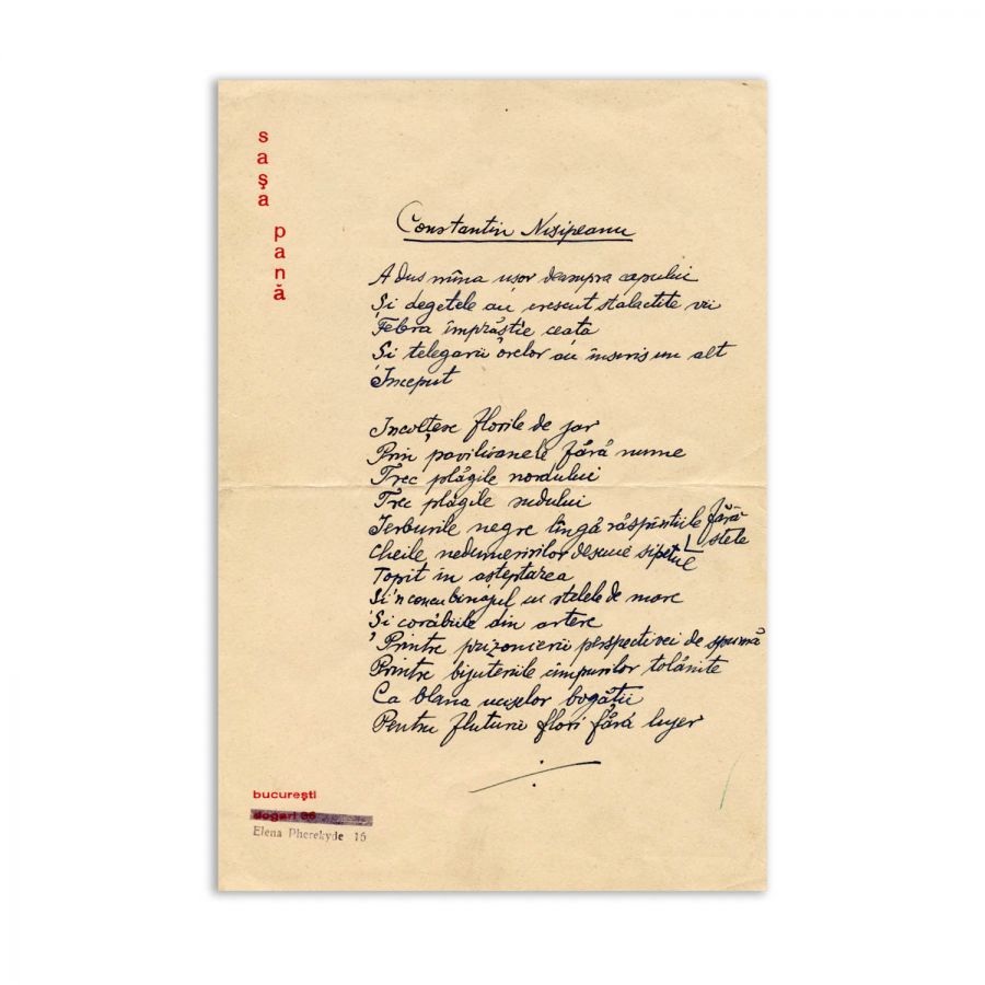 Poem redactat de Sașa Pană și dedicat lui Constantin Nisipeanu. Acesta este redactat pe două coli veline cu antetul autorului și semnat la final. Poezia este datată 26 august 1943.
