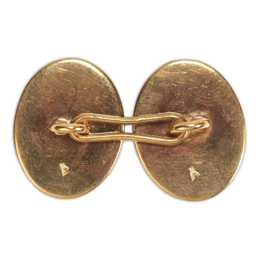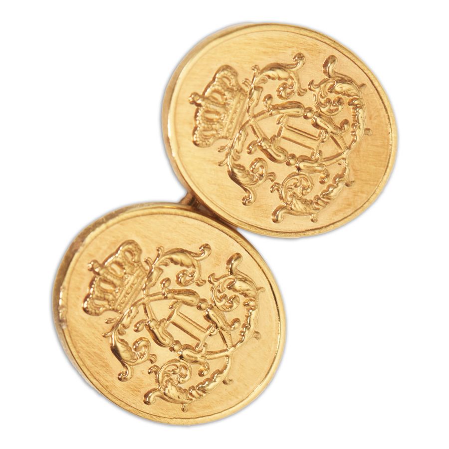 Set de butoni pentru manșete realizați din argint aurit, decorați cu monograma regelui Carol I al României. Pe revers regăsim marcajul argintului.