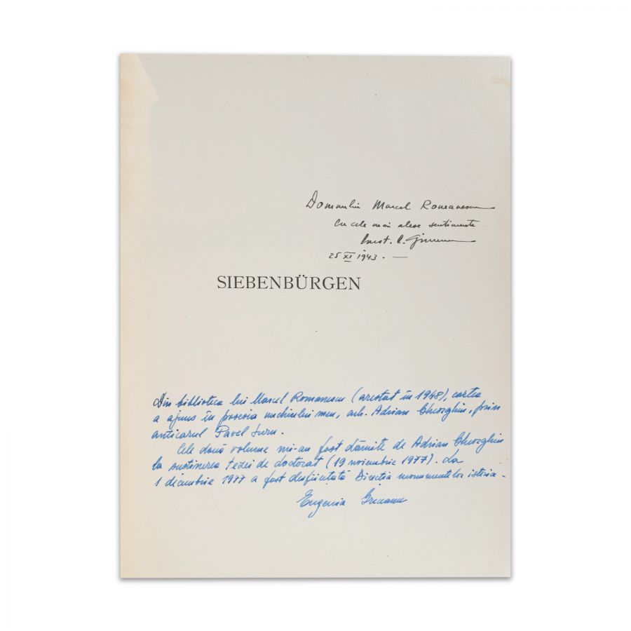 Siebenburgen, două volume, 1943, cu dedicația lui C. Giurescu pentru Marcel Romanescu