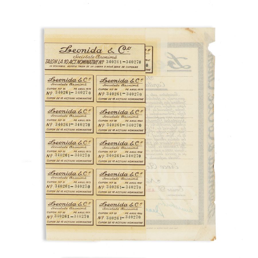 Acțiune nominativă în valoare de 500 lei emisă de Societatea Anonimă „Leonida & Co” pe numele lui Alice N. Arion, datată februarie 1943. Aceasta poartă un talon cu 29 cupoane.