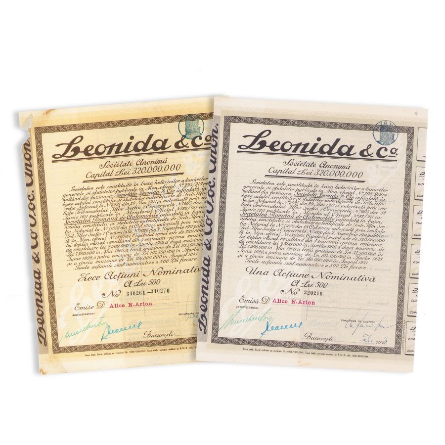 Zece acțiuni nominative în valoare de 500 lei emise de Societatea Anonimă „Leonida & Co” pe numele lui Alice N. Arion, datate februarie 1943. Poartă un talon cu 29 cupoane.