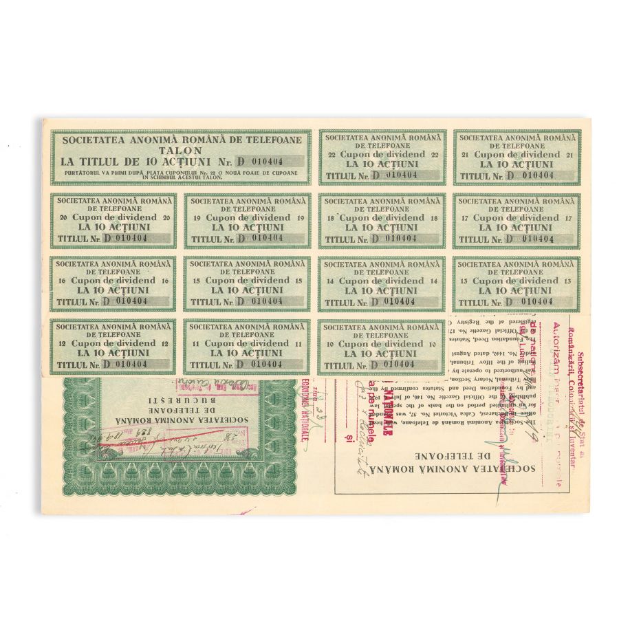 Titlu de 10 acțiuni în valoare de 10000 lei emis de Societatea Anonimă Română de Telefoane, cu 13 cupoane.
