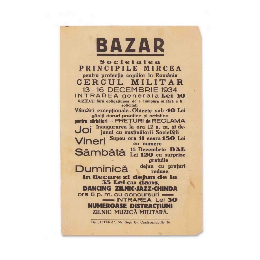 Afiș cu programul bazarului realizat de Societatea Principele Mircea pentru protecția copiilor în România ce urma să aibă loc la Cercul Militar între datele 13 - 16 decembrie 1934.