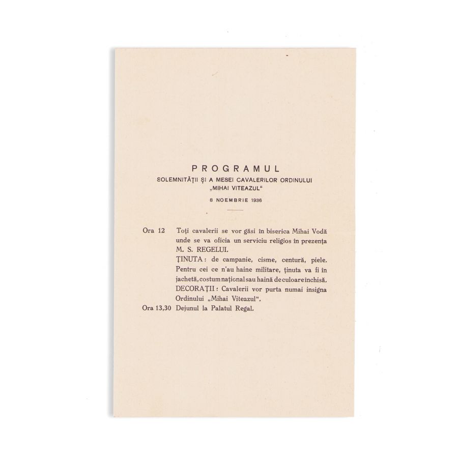 Programul mesei Cavalerilor Ordinului „Mihai Viteazul” din 8 noiembrie 1936.