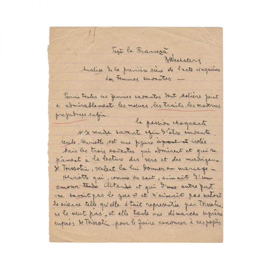 Teză la Franceză, semnată B. Wechsler, cunoscut prin aliasul său literar, Benjamin Fundoianu, cca. 1915.