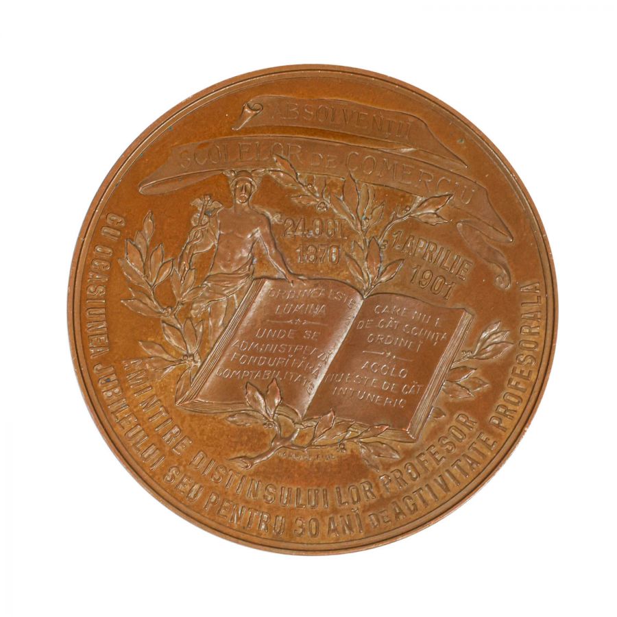 Medalie comemorativă bătută în amintirea economistului Theodor Ștefănescu cu ocazia jubileului de 30 de ani de activitate profesională 1870-1901. Pe aversul medaliei a fost reprezentată efigia lui Theodor Ștefănescu, iar pe revers legenda evenimentului. Medalia a fost comandată de absolvenții Școlii de Comerț drept omagiu adus profesorului lor. Aceasta a fost realizată din vermeil de către gravorul Carniol Fiul.