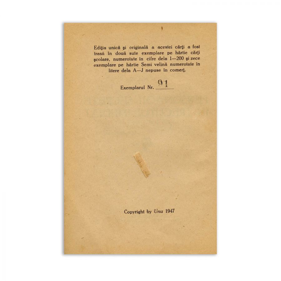 Ediția unică și originală a acestei cărți a fost trasă în 200 exemplare pe hârtia cărții școlare, numerotate în cifre de la 1-200 și 10 exemplare pe hârtie Semi velină numerotate în litere de la A-J nepuse în comerț. Exemplarul de față poartă numărul 91.