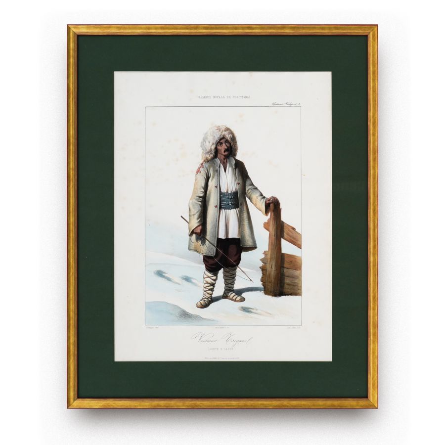 Litografie intitulată Voiturier tsigane - route d’Iassy realizată de gravor Michel Bouquet și publicată în volumul Galerie Royale de Costumes. Costumes Valaques 3. Aceasta a fost litografiată de Janet-Lange și tipărită la Paris, Chez Aubertet & Cie., Imp. D'Aubert et Comp. Litografia a fost colorată manual în epocă.