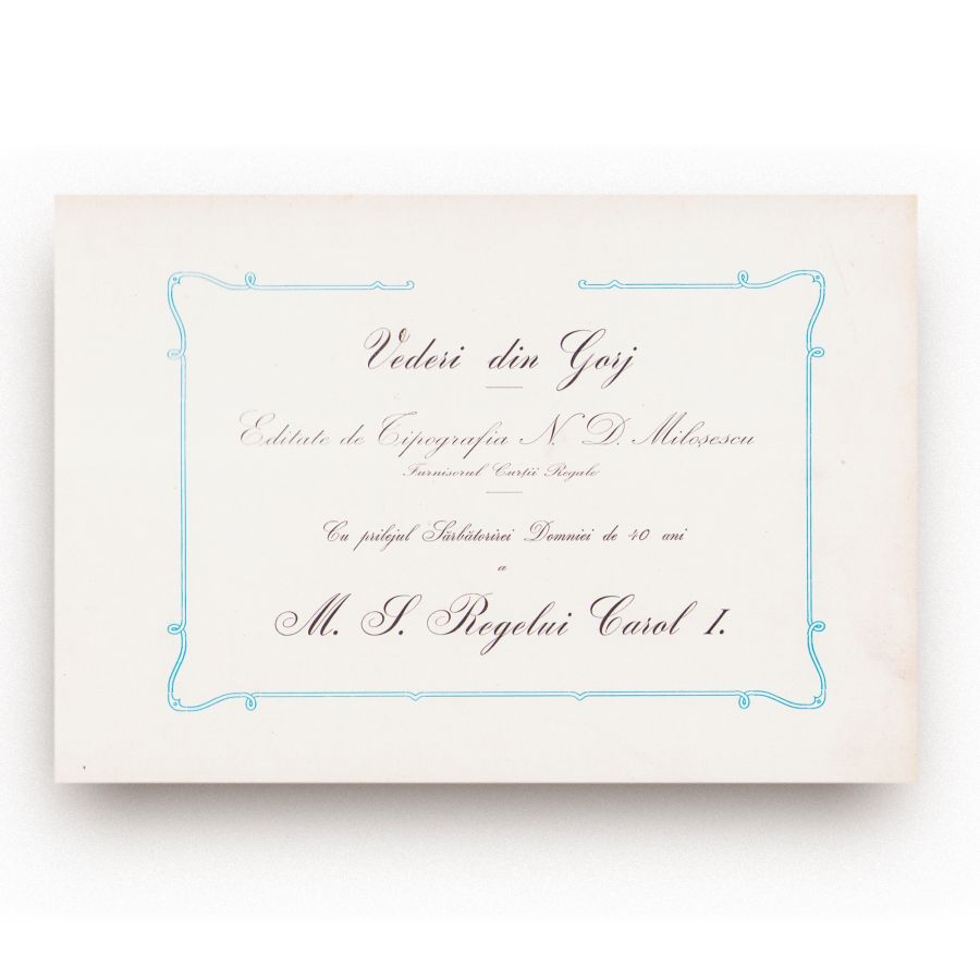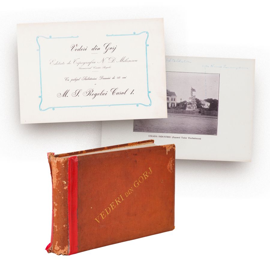 Vederi din Gorj, editate de tipografia N. D. Miloșescu, furnizorul Curții Regale. Album realizat cu prilejul sărbătoririi domniei de 40 ani ai M. S. regele Carol I, 1906, 24 file.