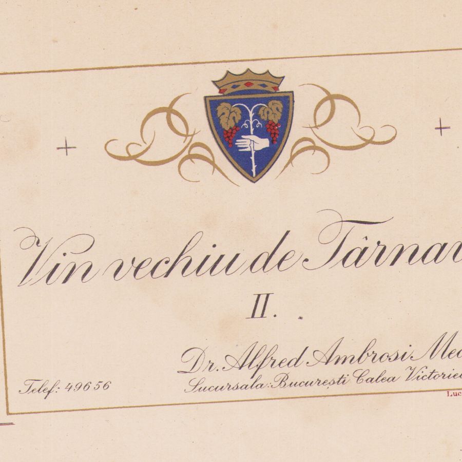 Etichetă de epocă pentru vin vechi de Târnava, o producție a celebrei podgorii Ambrosi din Mediaș.