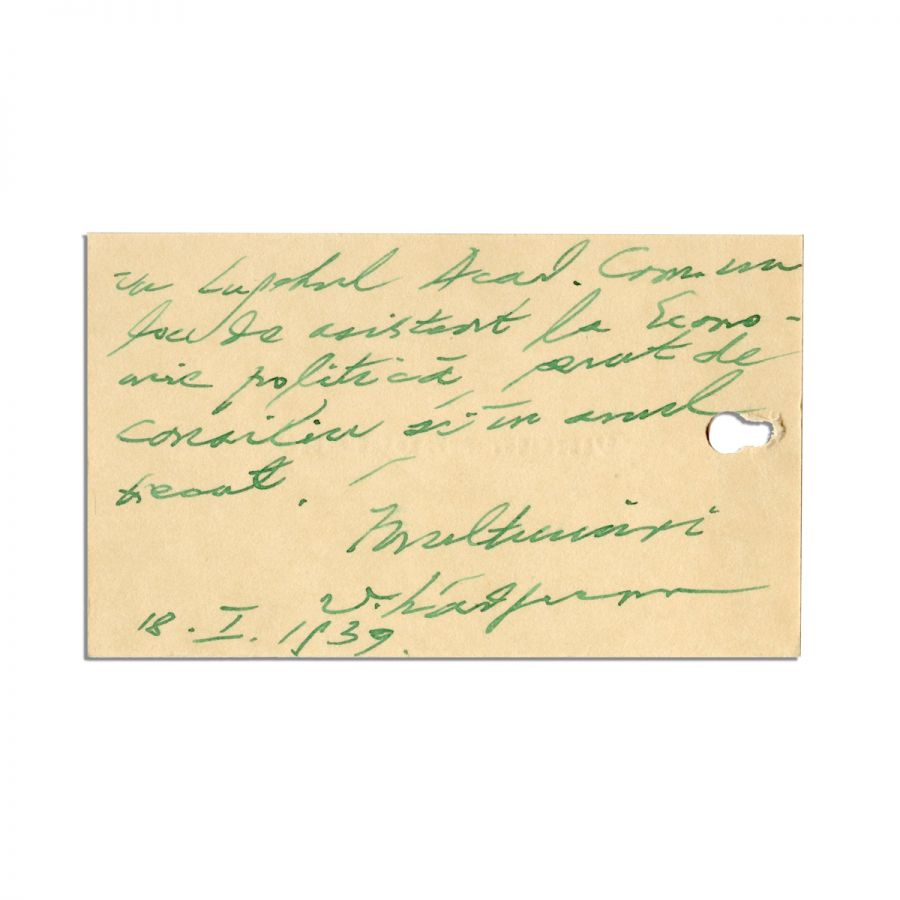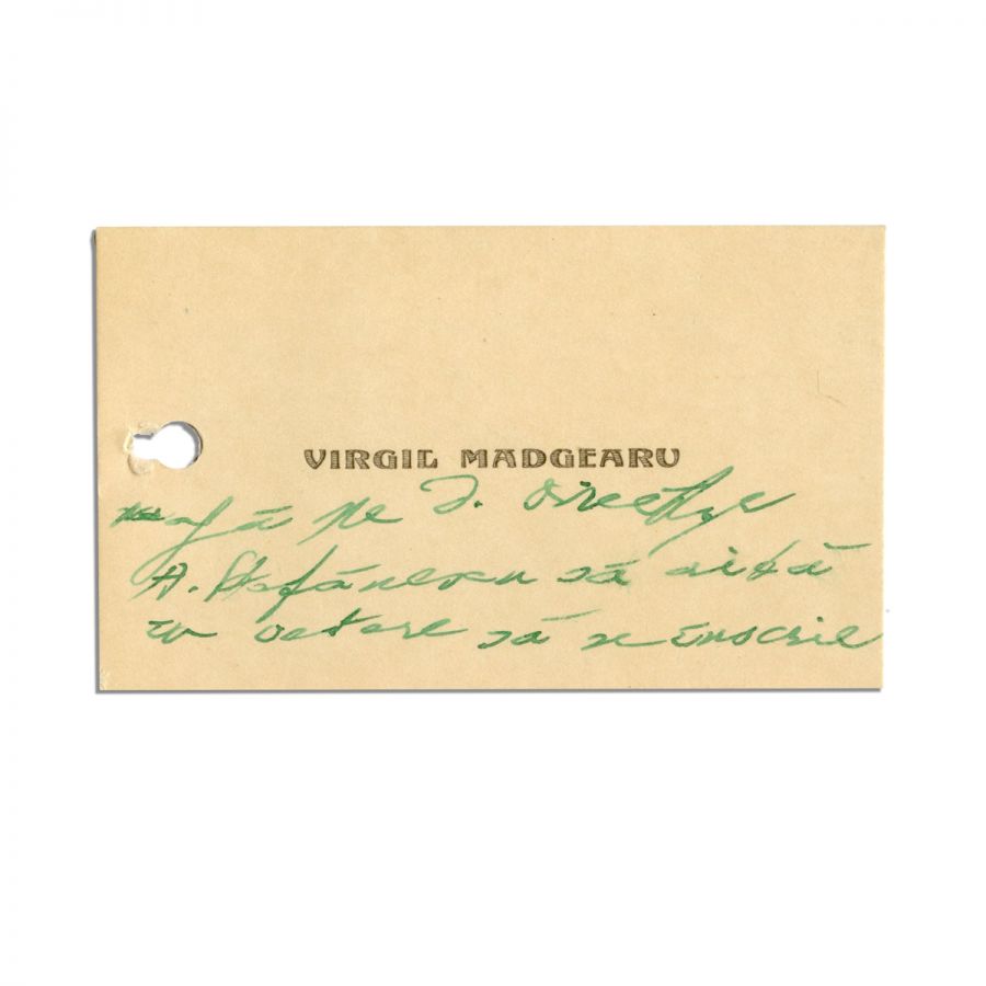 Carte de vizită ce a aparținut lui Virgil Madgearu (1887-1940). Aceasta prezintă o amplă însemnare olografă, redactată recto-verso cu cerneală verde, datată 18 ianuarie 1939.